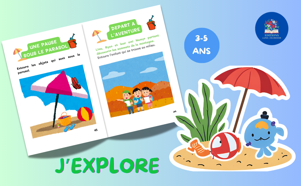 - 🌍 Exploration et vocabulaire (« J’explore ») : Reconnaissance des aliments, initiation à l’environnement marin, apprentissage des positions spatiales (avant, arrière, dessus, dessous…).